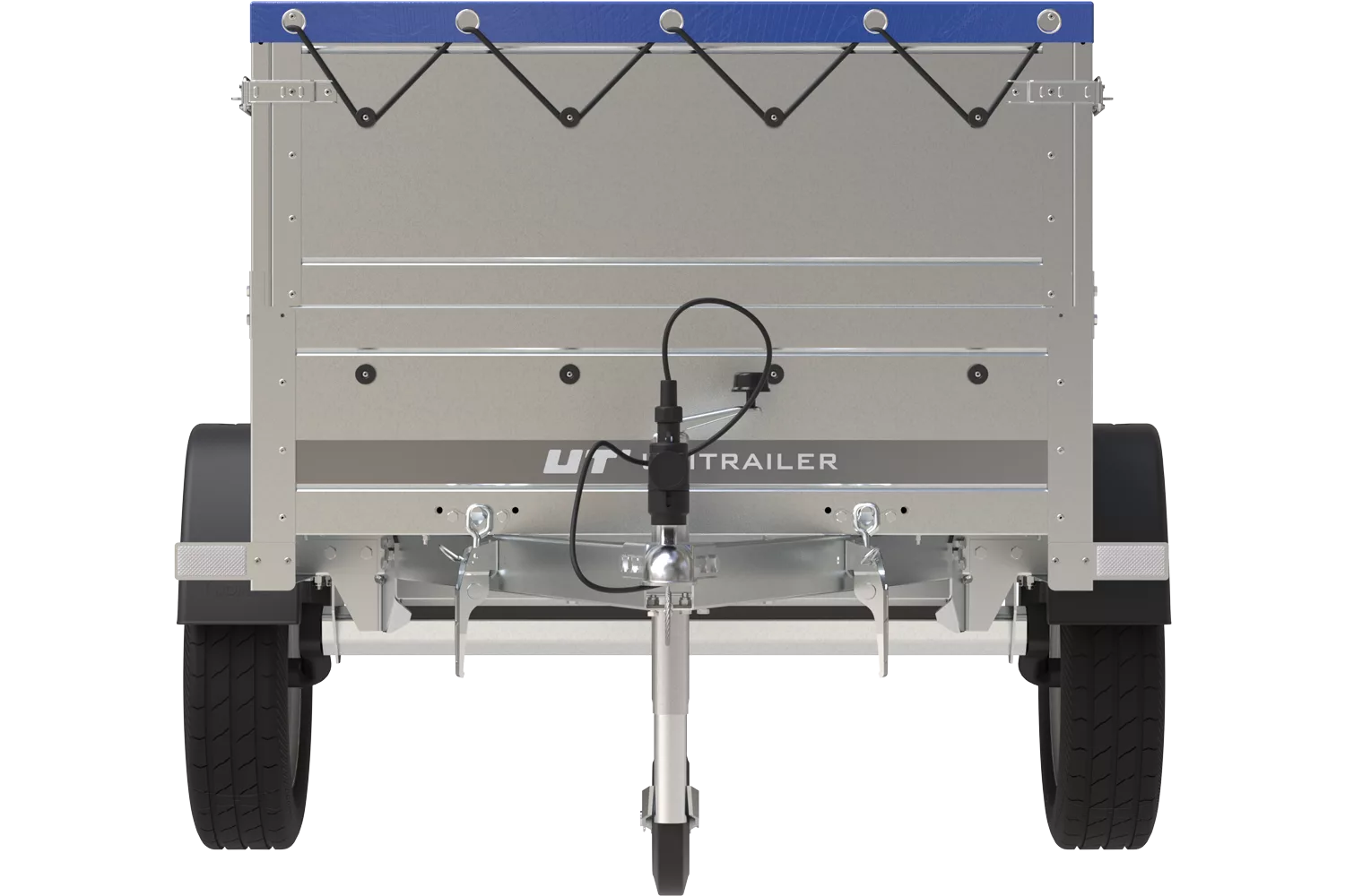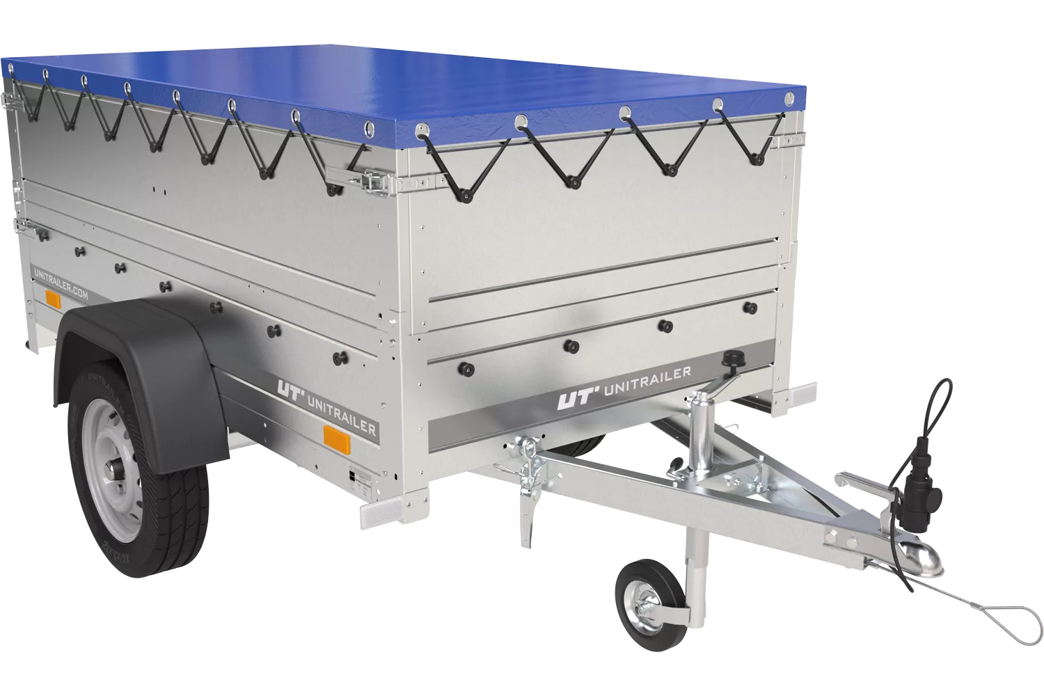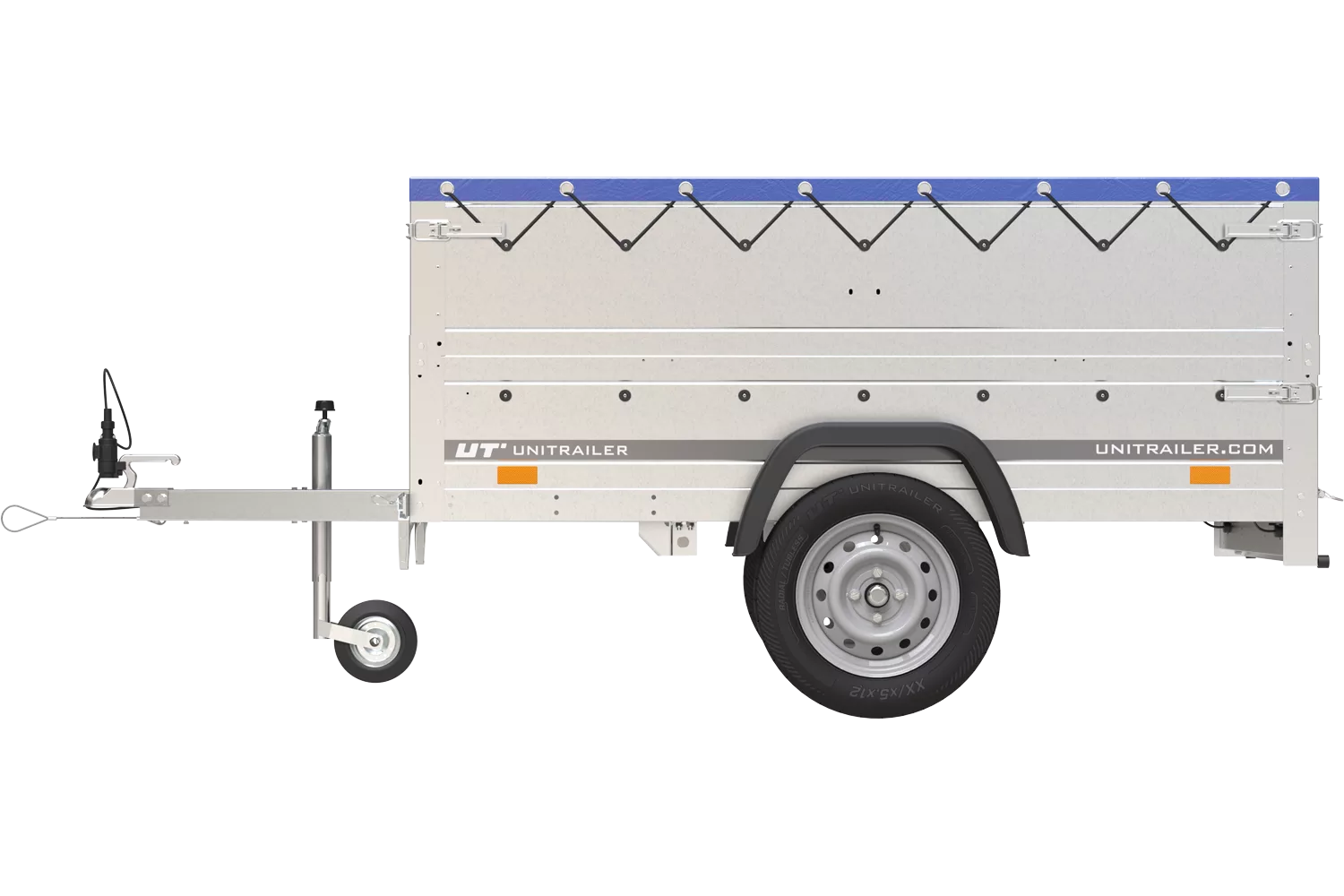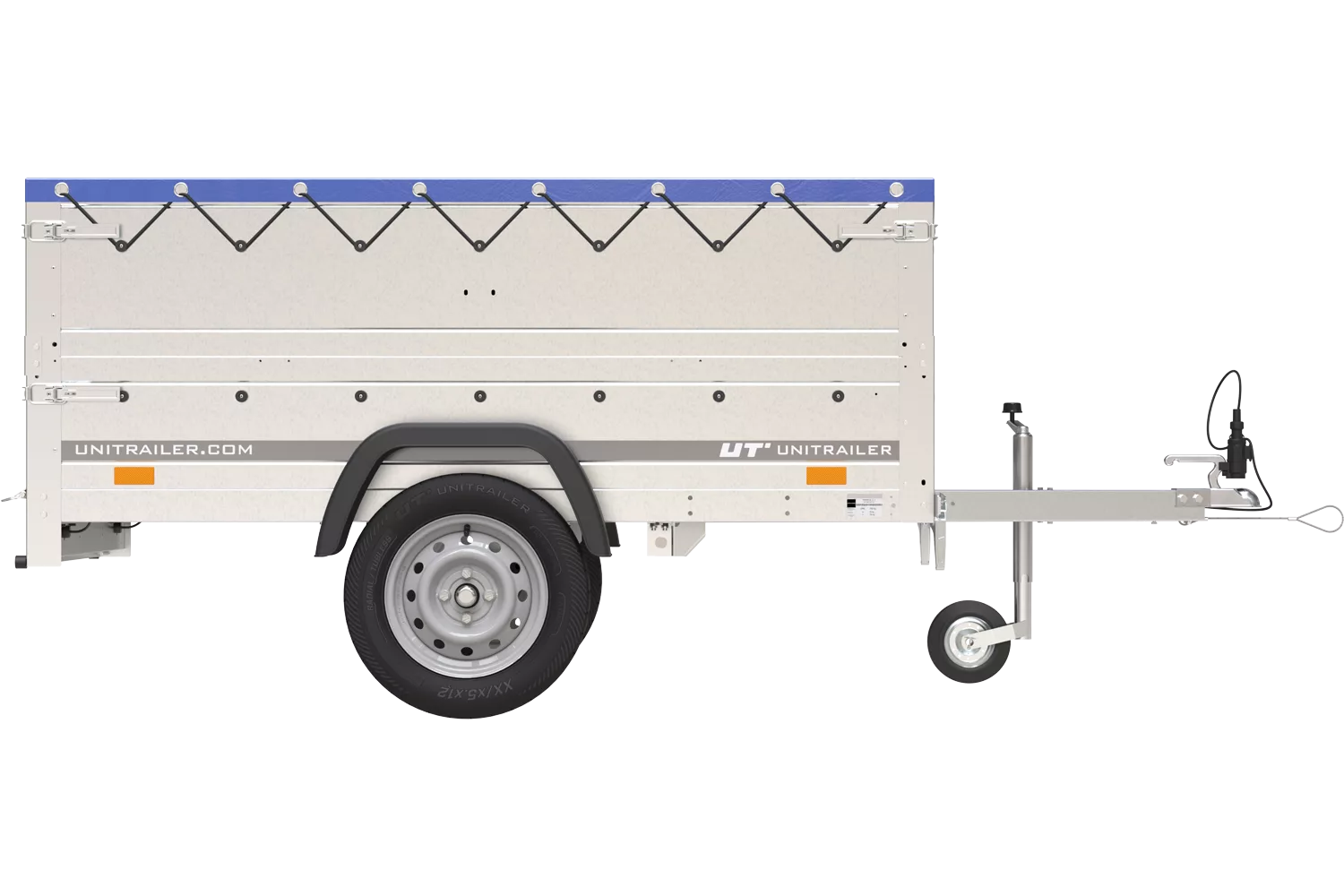 Garden Trailer 200 Kipp-Autoanhänger mit Stützrad, zwei Seitenwänden, H-0-Rahmen und flacher blauer Plane