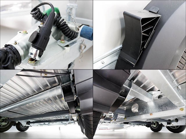 – Blattfedern | Verzinkte V-Deichsel mit Zugkugelkupplung | Stützrad | Rückfahrautomatik